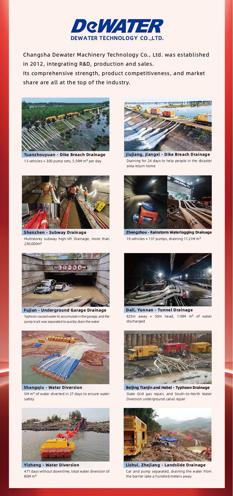 Changsha Dewater Machinery Technology Co., Ltd. (Dewater Technology) was established in 2012. It integrates R&D, production and sales, and is a leading enterprise in mobile emergency water supply and drainage equipment. Dewater Technology focuses on providing customers with lightweight and intelligent water supply and drainage equipment, including two series: modular water supply and drainage vehicles and portable permanent magnetic pumps. It has provided more than 10,000 sets of equipment to more than 500 core customers in emergency, fire protection, municipal administration, water conservancy, etc., and is currently sold in markets such as China, South Korea, Thailand, and the Netherlands.